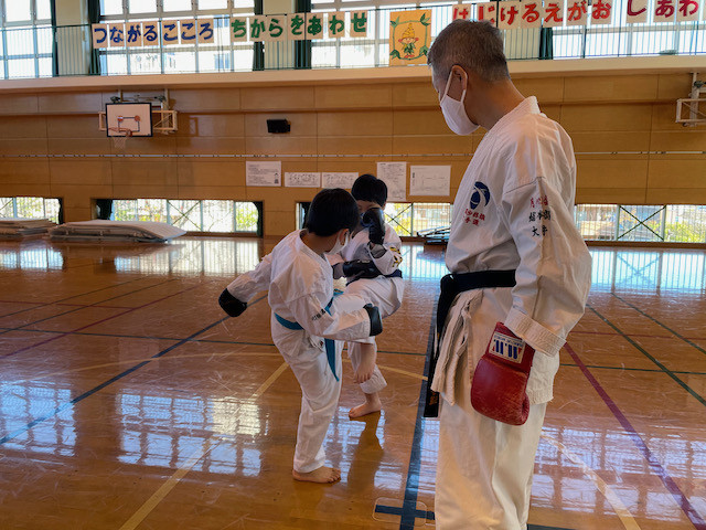 組手練習では、まだ本格的な組手練習ができないので、子供に大人相手の軽い練習だけ再開しています。