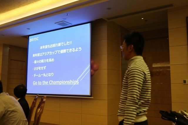 忘年会は楽しい企画を立ててくれた加藤さんありがとうございました。アジアカップの振り返り映像や練習風景をまとめて皆さん感動でした。一年の振り返りが出来て良かったと思います。また、今年入部してくれた方も来年一年楽しい思い出を残して、次の忘年会の時はもっと笑える様に楽しみましょう!