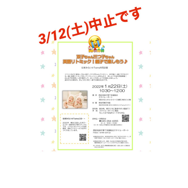 3/12(土) 「英語でリトミックを楽しもう」中止のお知らせ