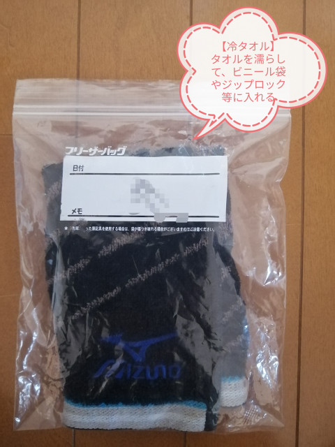 「冷タオル(タオルを濡らして、ビニール袋やジップロック等に入れる)」