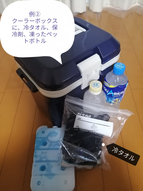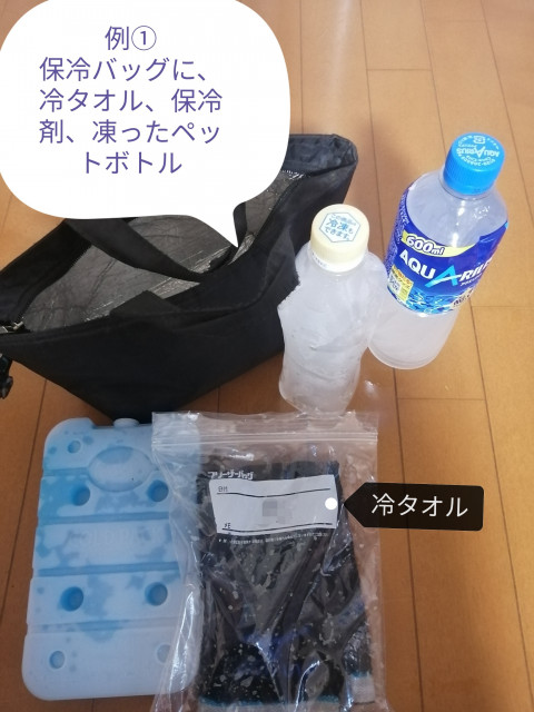 保冷バッグやクーラーボックスに、冷タオル、保冷剤、凍ったペットボトル、予備のドリンク、ゼリー飲料等のご用意をおすすめします。
