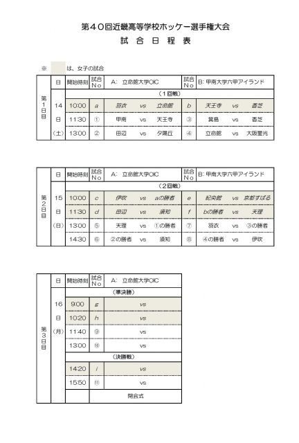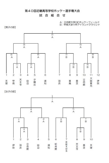 立命館大学OICホッケーフィールドと甲南大学六甲アイランドグラウンドを会場に実施される、第40回近畿高等学校ホッケー選手権大会の組み合わせ、試合日程は次のとおりです。今回の大会では、須知高等学校は男女とも出場します。ぜひ、ご声援をよろしくお願いいたします!