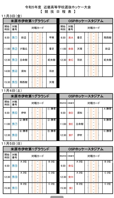 令和5年11月3日(金)から5日(日)にかけて、OSPホッケースタジアム(滋賀県米原市春照105)で開催されます、選抜近畿予選の組み合わせは次のとおりです。本大会では、須知高校男子ホッケー部、女子ホッケー部が出場します。ご声援のほどよろしくお願いいたします。
