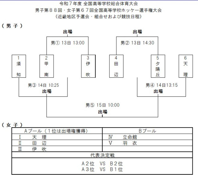 ※男子は代表決定戦の各勝者5校が、女子はAプールの1位及び代表決定戦の各勝者3校がそれぞれ8月に鳥取県で開催される「男子第88回・女子第67回全国高等学校ホッケー選手権大会」への出場権を得ます。