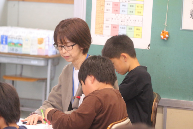 午後の4年生の算数では、別の「ちいセン」の方が参加してくださいました。こちらは授業の解説がメインだったため、ボランティアとして活動に入る場面は少なかったようですが、授業の様子を見守っていただきました。
