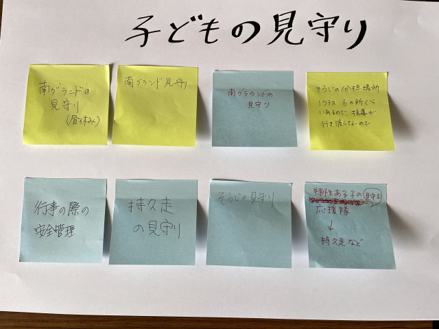 先週の職員研修で、先生方にコミュニティ・スクールや「ちいセン」活動についてお伝えした際、付箋を使った簡単なワークで「先生方が地域に何をやって欲しいか」という課題をヒアリングしました。