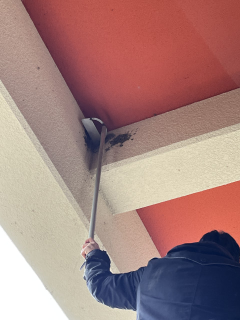 今日は朝から、高さ3メートルほどの脚立に登っての大仕事でした。給食室や1年1組の教室、校長室の前など、学校のいたるところに作られたツバメやハトの巣を撤去する作業です。