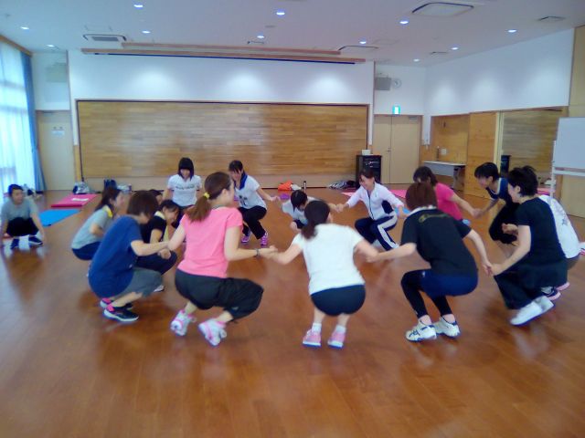 みんなで手をつないで右、左に飛ぶという筋トレです。