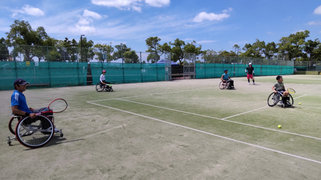 毎年、8月から10月までの日曜午前に6回、車いすテニス教室を開催しています。 今日は3名の方が参加してくれました! 日射しが強い日で暑かったですが、皆さん練習を最後まで頑張りました。