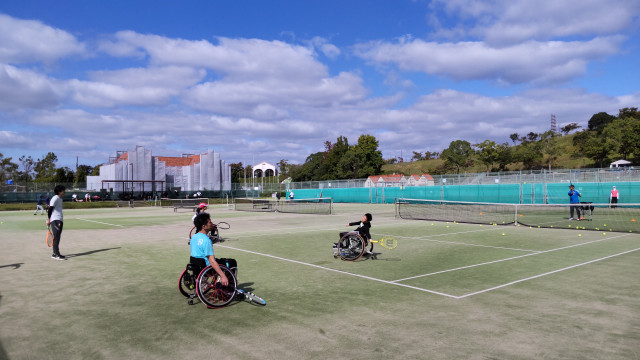 今年も8月から11月までの日曜午前に6回、車いすテニス教室を開催しています。 今日は雲が多めだったけど、長かった夏日もやっと終わって、なかなかのテニス日和。 車いすの方は2名参加してくれて、大学生も手伝ってくれて、楽しいテニスになりました!