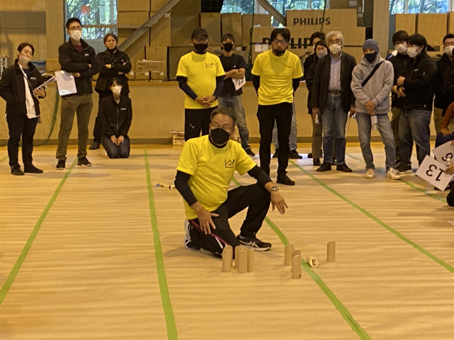 この大会の企画運営は「くにたちエール」が担当、エールのスタッフ6名(大髙、大谷、辻、濵﨑、保坂、森本)の他、日本モルック協会(以下、JMA)公認指導員の星野さん、エールの会員でもありJMA認定競技団体「ふちゅモル」代表のツルさん、計8名が大会の審判員として参加しました。