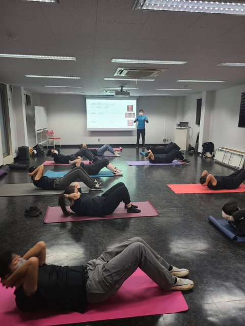 腹筋と上腕の筋肉についてのお話しのあとはエクササイズバンドを使って実際にその部位を鍛えました。