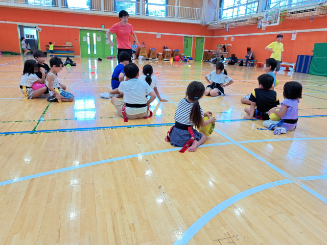 今日は、腰回りにタグをつけてボールを自分の陣地に運ぶゲームもしました。
