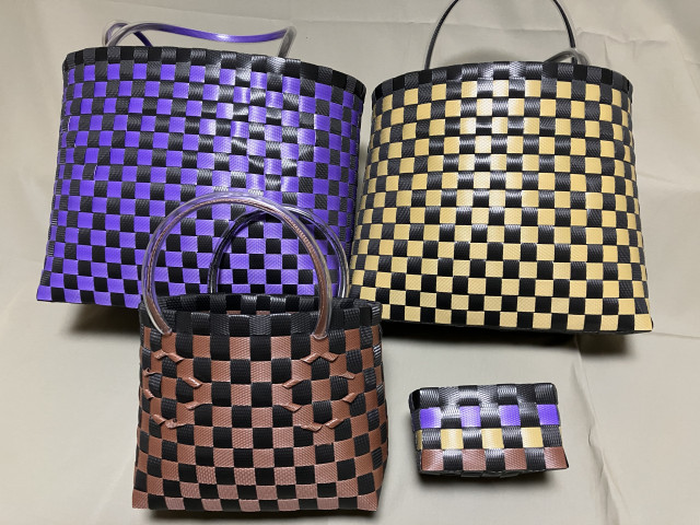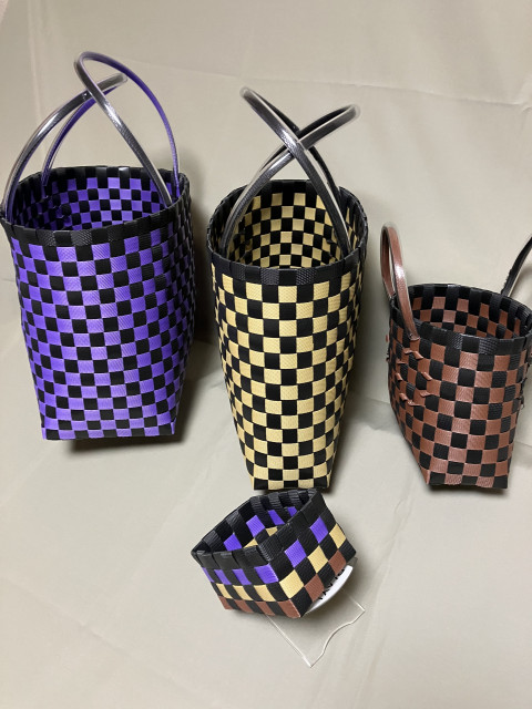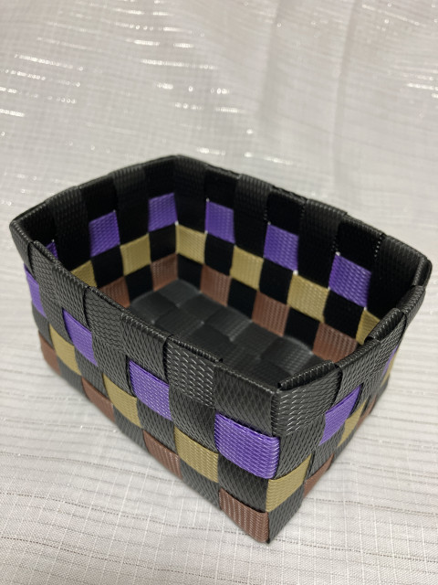 秋冬をイメージした黒ベースのチェックのプラカゴを作ります。差し色として 紫 ベージュ 茶の三色からお好きな色を選べます。