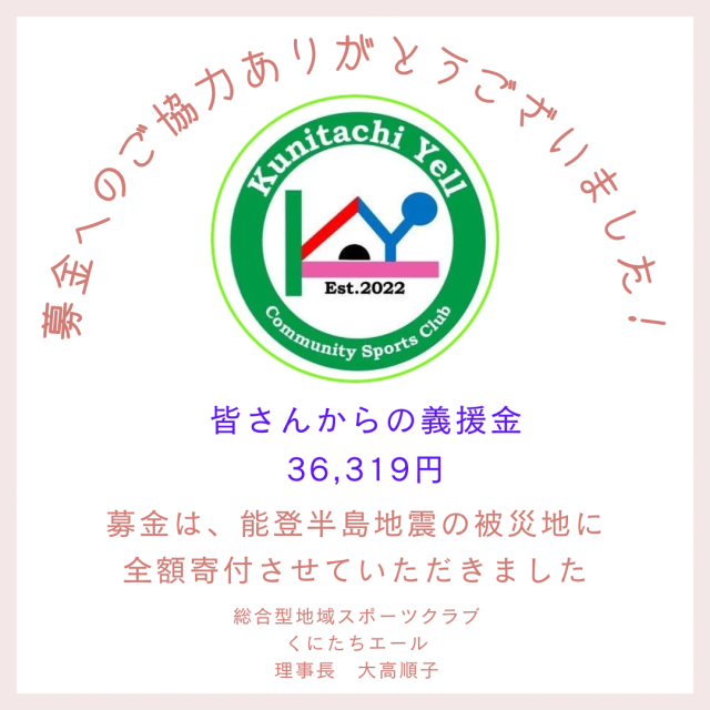 総合型地域スポーツクラブ・くにたちエールでは、各プログラム、大会において、1月から3月までの間に 被災者支援の募金活動を実施いたしました。