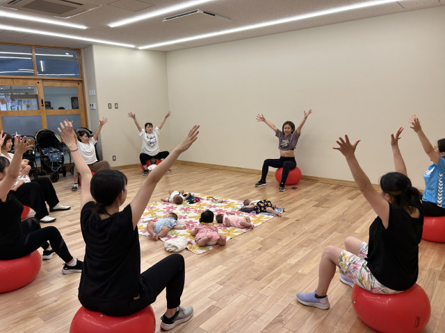 40分間という短い時間ですが、バランスボールに座って弾む有酸素運動と、授乳・おむつ替え・抱き上げなどの産後の日常の姿勢のレクチャーの二本立てで行いました。