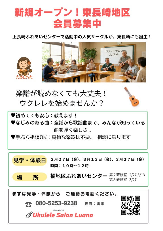 今までは上長崎ふれあいセンターのクラブとして活動していましたが2026年4月から橘地区ふれあいセンタで東長崎支部としてウクレレ教室として活動開始予定です。