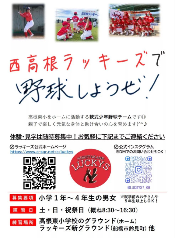 西高根ラッキーズは、Aチーム(6年生)、Bチーム(5年生)、Cチーム(4年生)、Dチーム(3年生)の対戦チームを募集しています。 ホームグラウンドの高根東小学校では土日祝日の活動が行える環境です。 また低学...