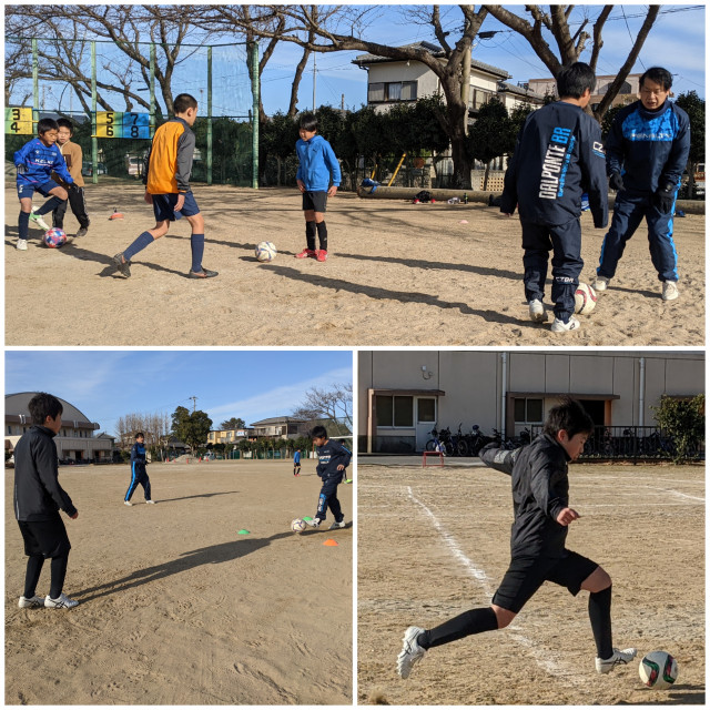 とにかく寒いのでまずはウォーミングアップ。ラダー、コーンを使ったサーキットでステップ練習やボールとコーンを使った一対一、シュート練習、ミニゲーム等を行いました。