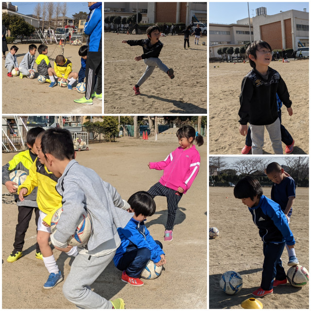 来年から小学校にあがる予定の新一年達はみんな朝からしっかり挨拶してくれました。ドリブルのあとミニゴールにシュートするゲームや2チームに別れてボールを取り合うゲームをしました。