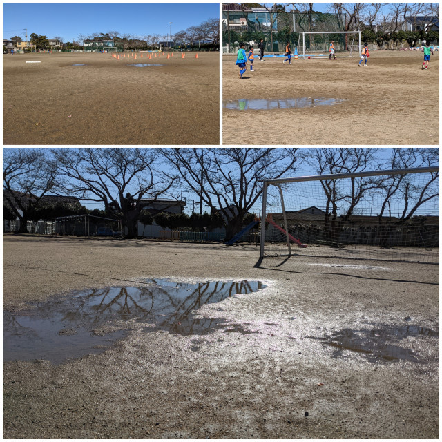 大雨注意報が出された昨日の雨のためグランドの水たまりが心配でしたが、思ったほどひどくなく、練習前にゴール前の水たまりをスポンジで吸いとって対応できました。
