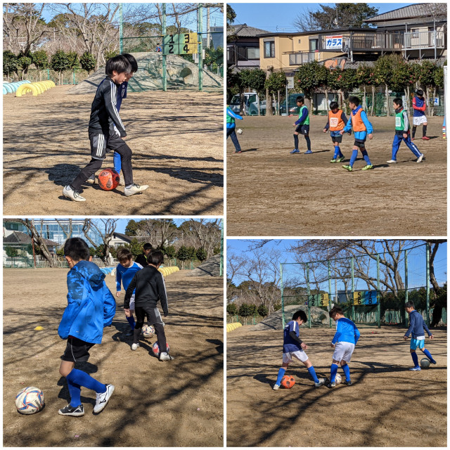 U-10チームは、先週の共同練習試合で得た課題をしっかり復習。試合では2人で3人を相手にする動き、チャレンジ&カバーを試すように教わったけど、覚えてるかな?