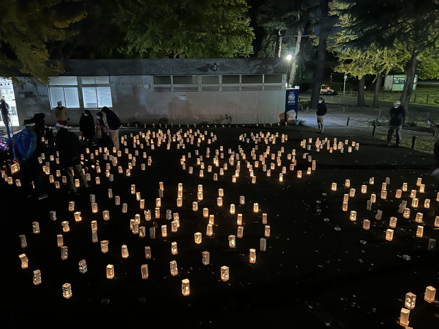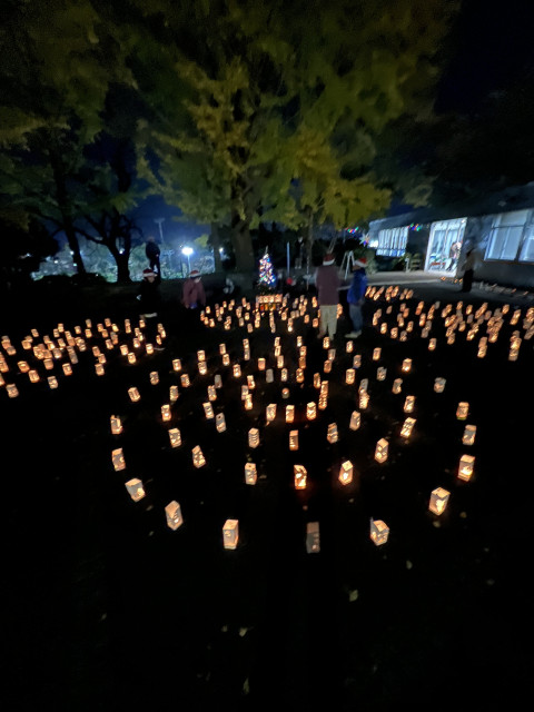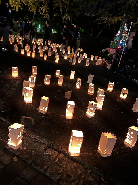 最初は風に邪魔され、なかなかきれいな景色とはなりませんでしたが、終盤風が収まりろうそくに彩られる三ツ沢公園の演出ができたと自画自賛していますw