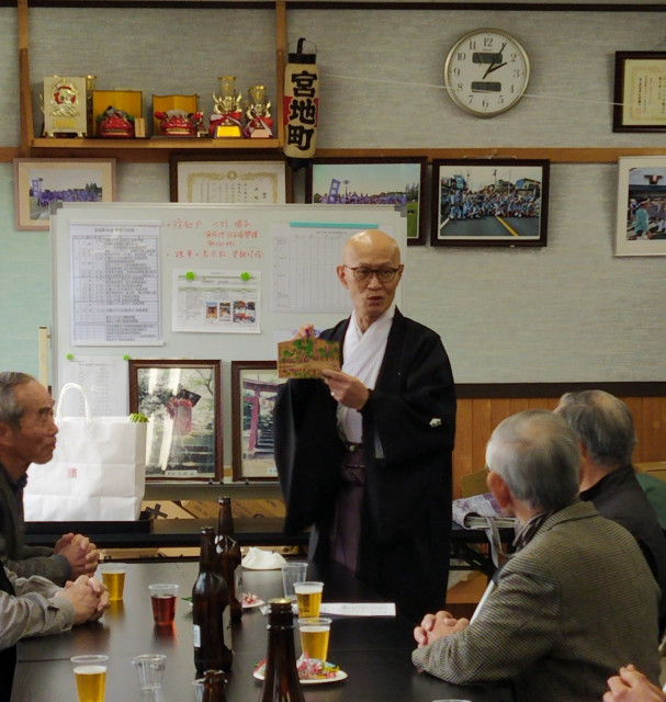 その後、町内会館内に移動し直会を開き、宮司様から宮地、鴻神社、お祭りの由来、歴史のご講話をいただきました。