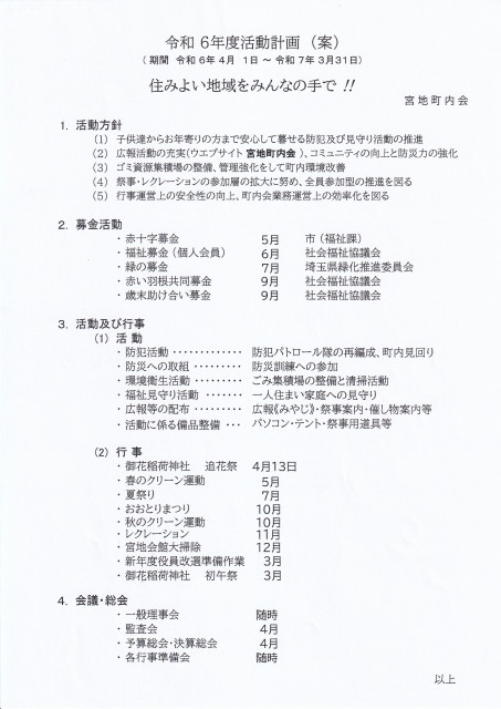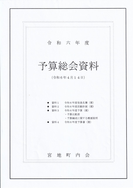 半袖でも過ごせるほどの好天の4月14日(日)、宮地会館にて理事、組長、執行役員が集まり、令和6年度の予算総会が開催され、参加者53名、委任状28名分のもと満場一致で下記の議案がすべて可決承認されました。皆様方からの貴重な町会費を有意義に使い、令和6年度も安全第一を心がけ、皆様のお力添えを得て昨年度以上の行事運営、設備拡充に努めてまいります。
