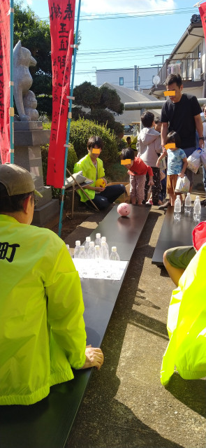 お子様には約200袋のお菓子の詰合せを配り、その後ペットボトルボーリング、投げ輪のゲームを楽しみ、たくさんのファミリーのニコニコ顔を見ることができ、私達もしあわせをいただきました。また、70歳以上の方には先着70名にいがまんじゅう、塩あんびんを配り、こちらもうれしい笑顔を眺めながらあっという間の35分間で終了となりました。