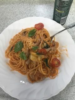 お昼には、畑でとれたトマトとバシルでバジルスパを作ってみました!