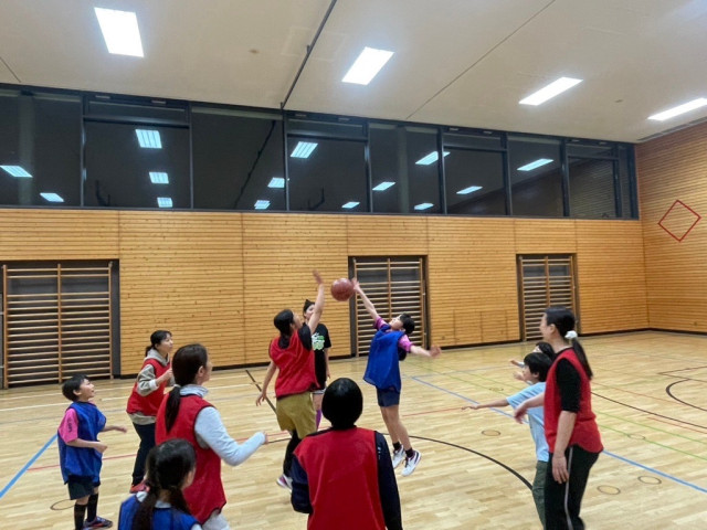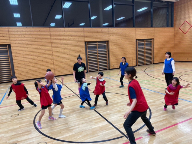 最終日特別イベントとして、「親子でバスケを楽しもう!」企画を開催しました。高学年は高学年一丸でパパママチームに挑戦、低学年は親子同じチームでゲームをすることにしました。
