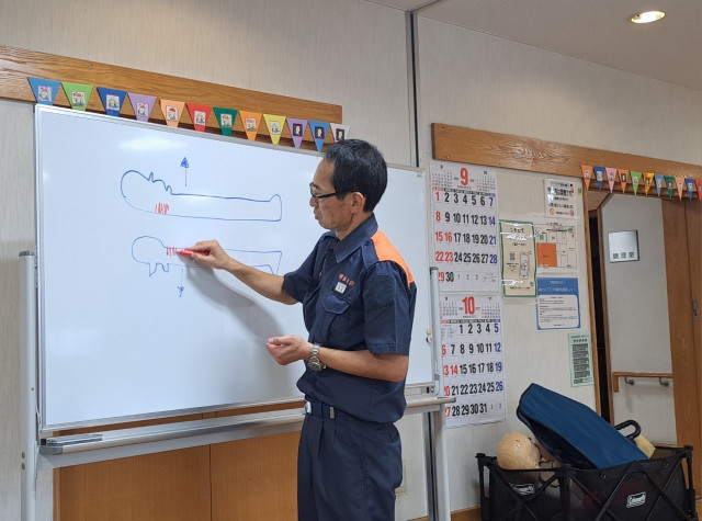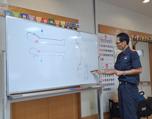 講師は、中消防署予防課の現役消防士さんにお越しいただき、実際の現場での経験を交えながら非常に分かりやすく教えていただきました。