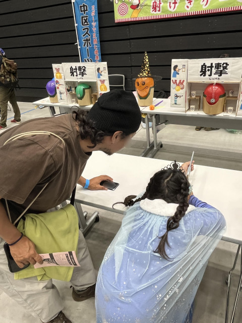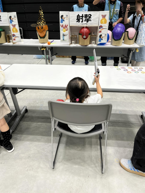私たちのブースは、オリンピックの種目である『射撃』を手作りした輪ゴム鉄砲で模した『射撃』ブースを出展しました。
