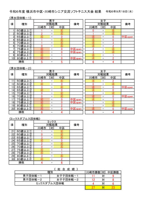 令和6年度 横浜市中区・川崎市シニア交流ソフトテニス大会 結果
