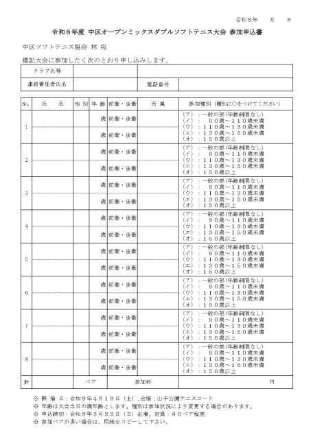 ⑵ 令和8年度_中区オープンミックスダブルスソフトテニス大会_申込書