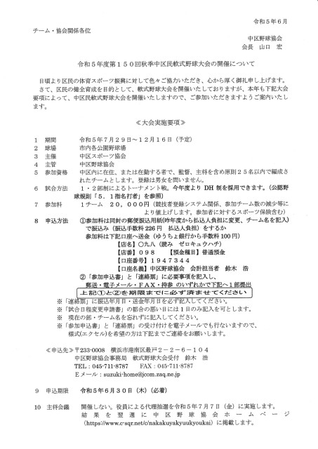 募集要項等希望する方は、中区野球協会理事長 石田までお問い合わせください。090-9001-3519 石田携帯