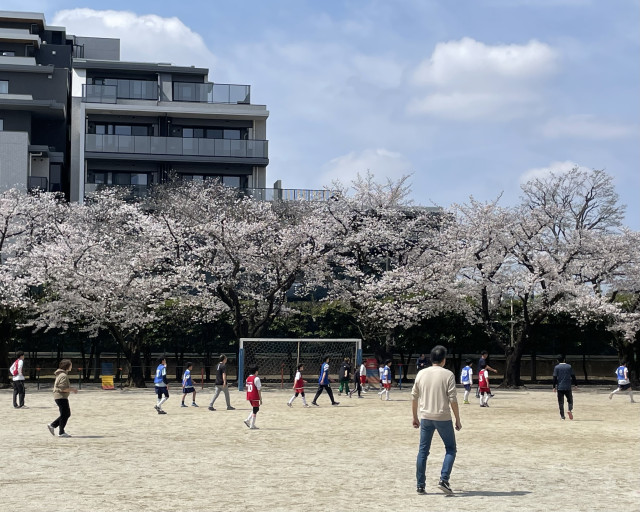 7分咲きの桜が舞い散る中、子どもたちの元気な声と、それに応える親たちの笑顔がグランドいっぱいに広がっていました。