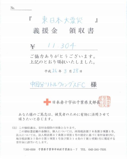 大きな力にはなれませんが、皆様からのお気持ちを義援金として活用してもらうべく、日本赤十字社にお預けしました。(末次コーチにご尽力いただきました)