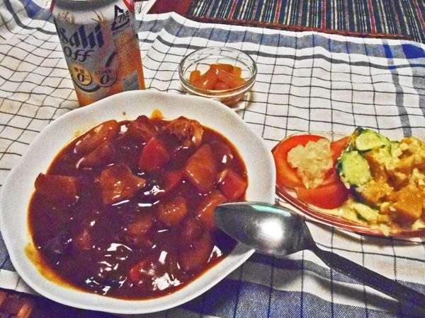 早速暑いがジャガイモたっぷりのカレー、汗かきながらの健康志向ビールが