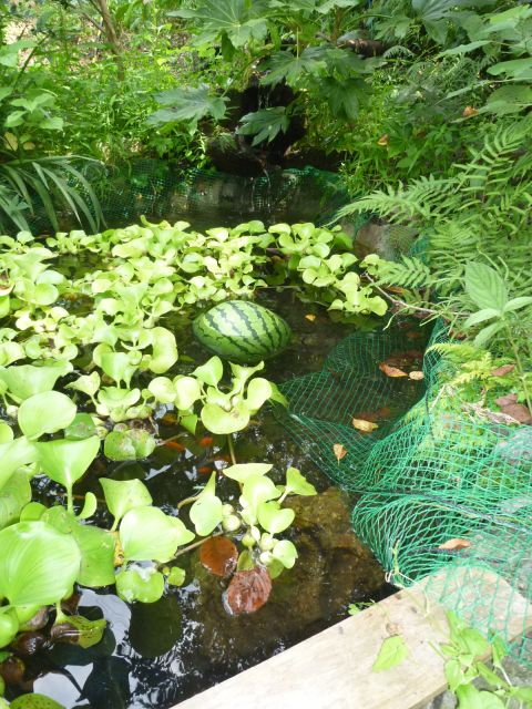 30cmのスイカを、お隣でもらい池で冷やしています。池の水は山から引いているので