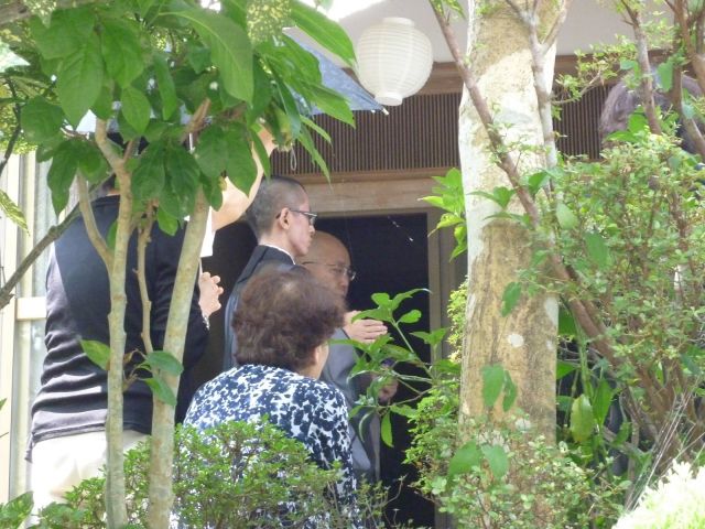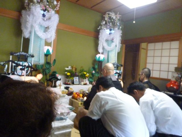 お坊さんは初盆の家を訪問し、玄関先の盆棚(餓鬼棚とも呼んでいる)で約10分間読経します。