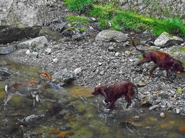 猟犬二匹若い鹿を箕面川で襲っているところに出くわした。パトカーは来るは