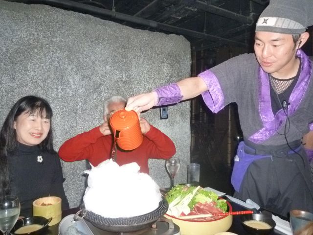 地下の薄暗いレストラン、スタッフ全員が忍者の容姿。忍術でテーブルマジックも披露してくれました。