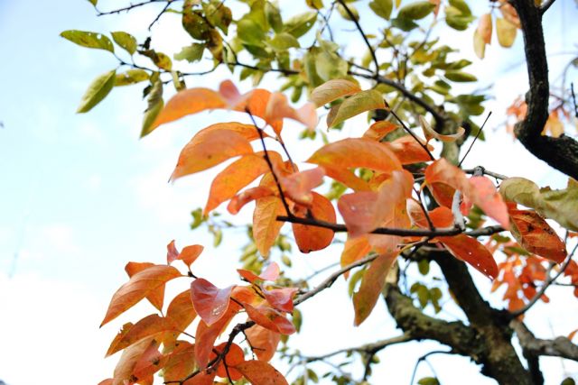 庭の柿の木も綺麗に赤く染まりましたが、一部まだ緑の葉っぱが…