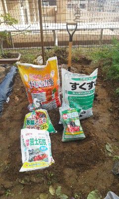 畝作りこれが大事 苦土石灰 培養土(馬糞)油カス 肥料(8.8.8チッソ・リンサン・カリ)