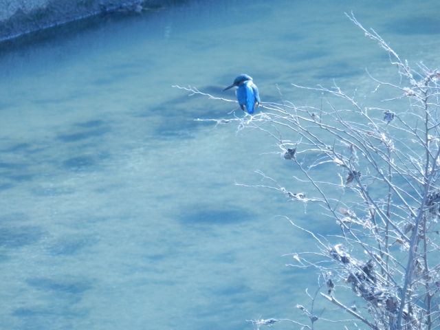 今朝の生駒はマイナス1度 粉雪舞い散る中、ブルブル震えながら,いつもの竜田川岸を散歩していると・・・・カワセミを発見。