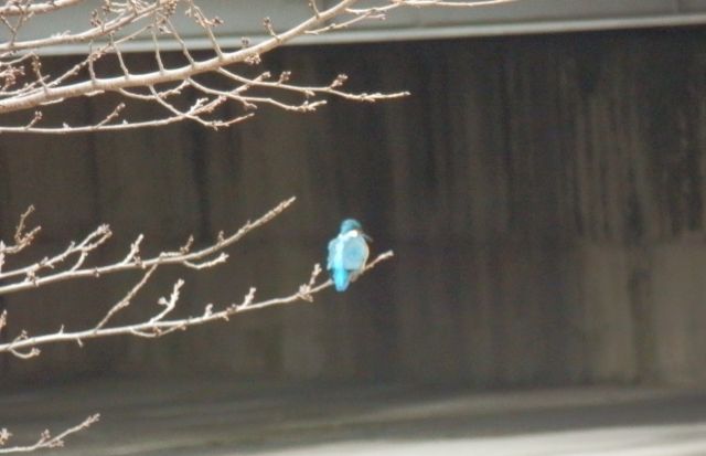 9時前に川面すれすれに飛んで来た。「空飛ぶ宝石」と言われるだけに、他の野鳥とは見分けがつく。しかし、そのまま飛んで行った。 15分後、再び現れ桜の枝に止まった。 前回は3M設定だったので、今回は18Mに設定し、生データを福ニィに渡そうと慎重にシャッタチャンスを狙っていたが・・・逃げられた。後姿を撮っても意味がない。クチバシが写るように横をむく瞬間を狙ったが・・・失敗