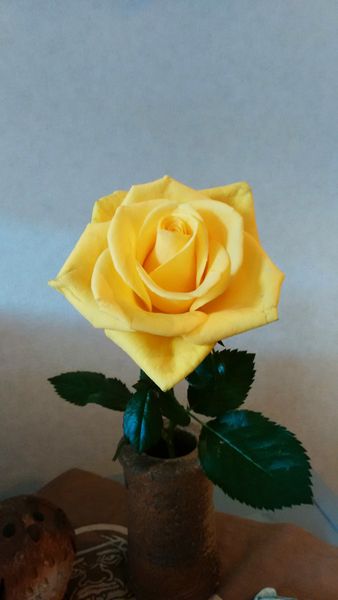 喫茶店に預けて置いたら蕾だった黄色いバラが綺麗に咲いた。