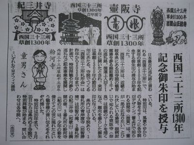 お元気です会の皆さん、朝日新聞に掲載されていましたが。「西国三十三所」で草創1300年記念御朱印の授与が始まったそうです、将来三途の川を渡る時のパスポートとして必要です。そろそろ用意してみませんか?わが町の粉河寺は3番です。
